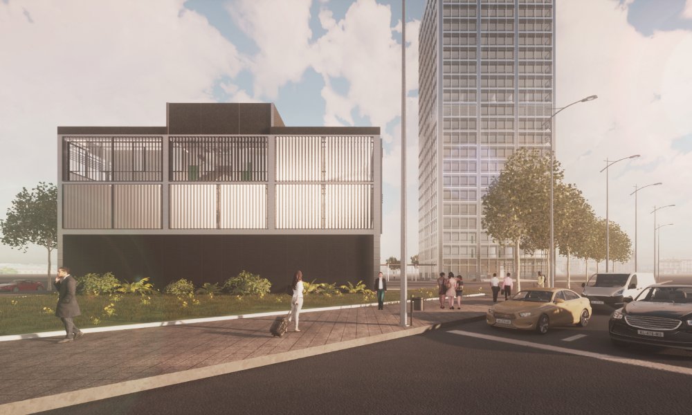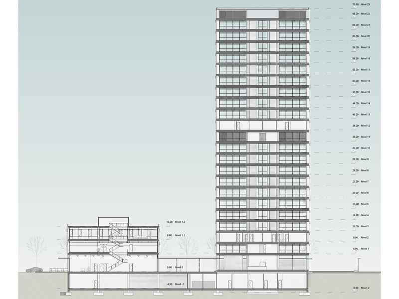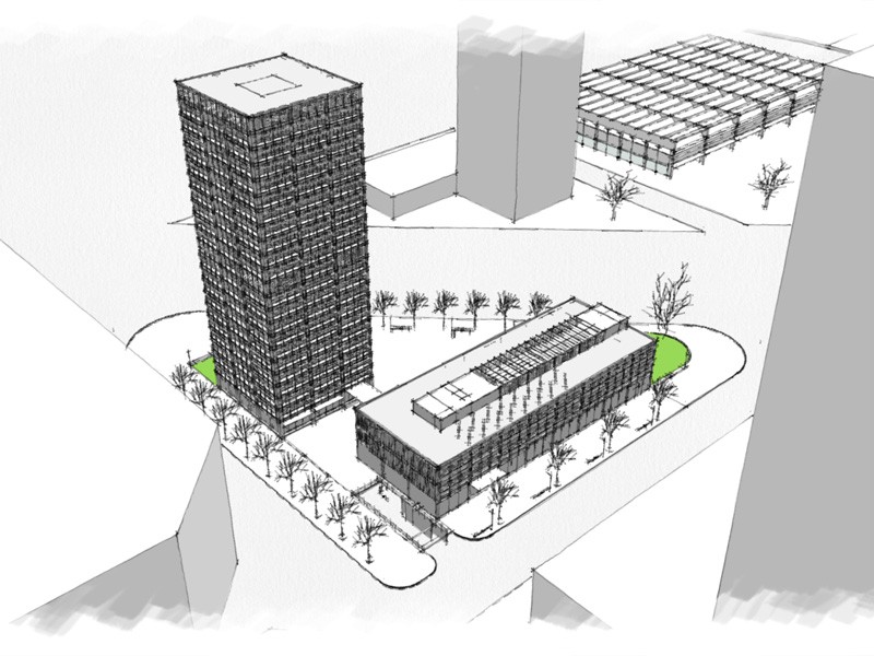 Es proposen dos edificis; una torre de 22 plantes per a hotel i apartaments, i un volum horitzontal per a centre d’estudis i oficines. Els dos edificis s’uneixen compartint un soterrani per a aparcament.