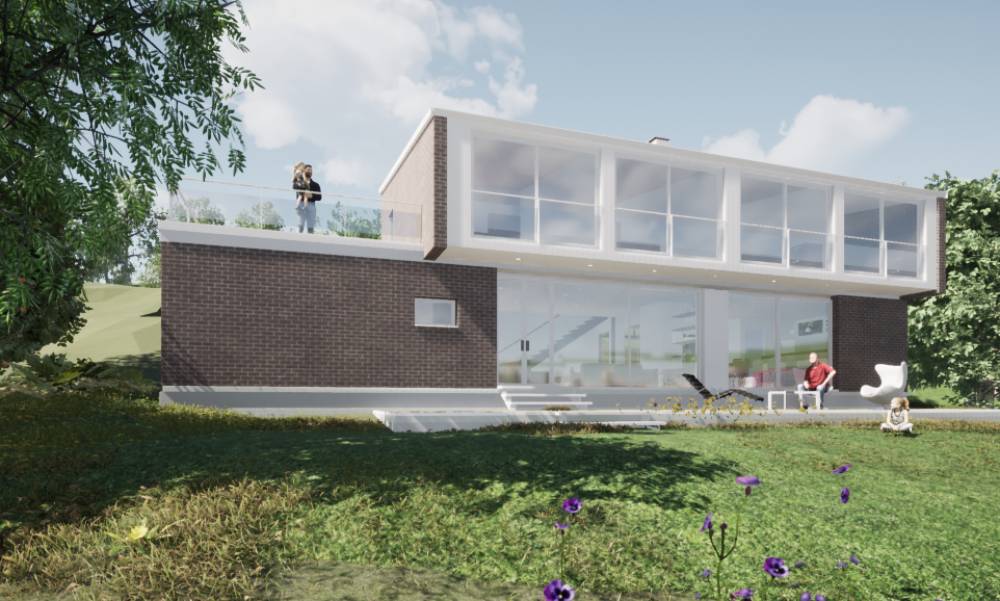 La parcela tiene una pendiente pronuncia­da hacia el Sur y se accede a ella por el Nor­te. La casa se conforma con dos volúmenes que se superponen. Un primer rectángulo en planta baja para las zonas comunes, dormitorios de invitados y la terraza que es prolongación de la zona de estar y que constituye un espacio importan­te para las reuniones sociales. Mientras que en la planta superior están los dormitorios de la familia. Es una casa abierta y permea­ble, aprovechando al máximo la luz na­tural y el contacto con el entorno.