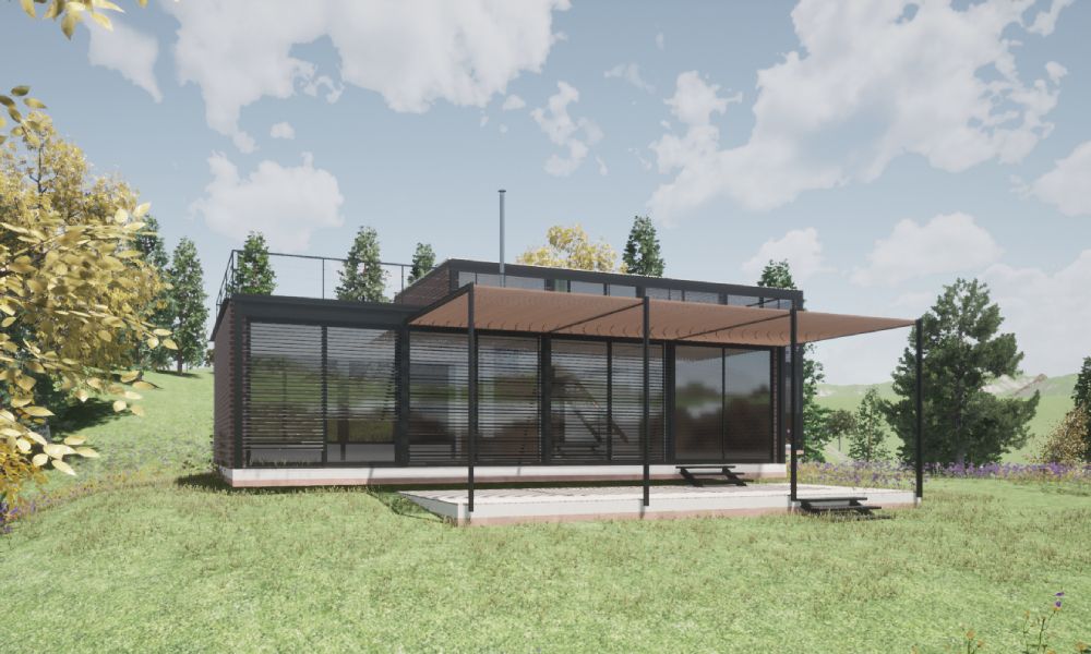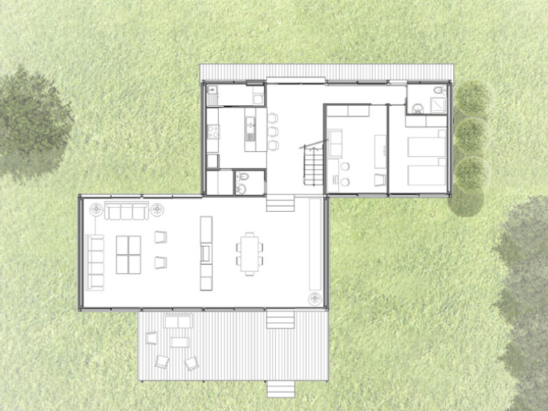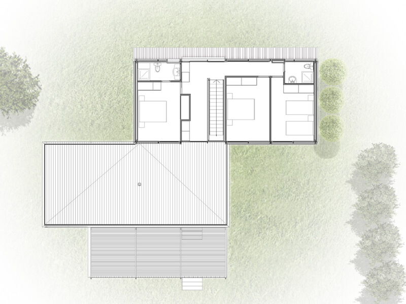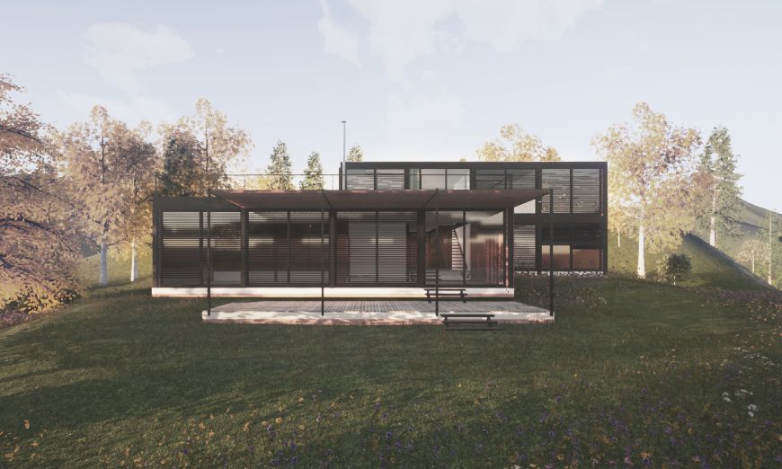 Proyecto para una vivienda unifamiliar aislada en el municipio del Montseny, comarca del Vallès Oriental. Vivienda de 206m², para una familia que reside en Barcelona. La casa se genera a partir de dos rectángulos en planta y en alzado que separan espacios comunes y privados.